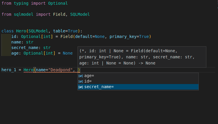 SQLModel adopts PEP 681 for Python type annotations to ensure the best developer experience, so you will get inline errors and autocompletion even while creating new model instances.